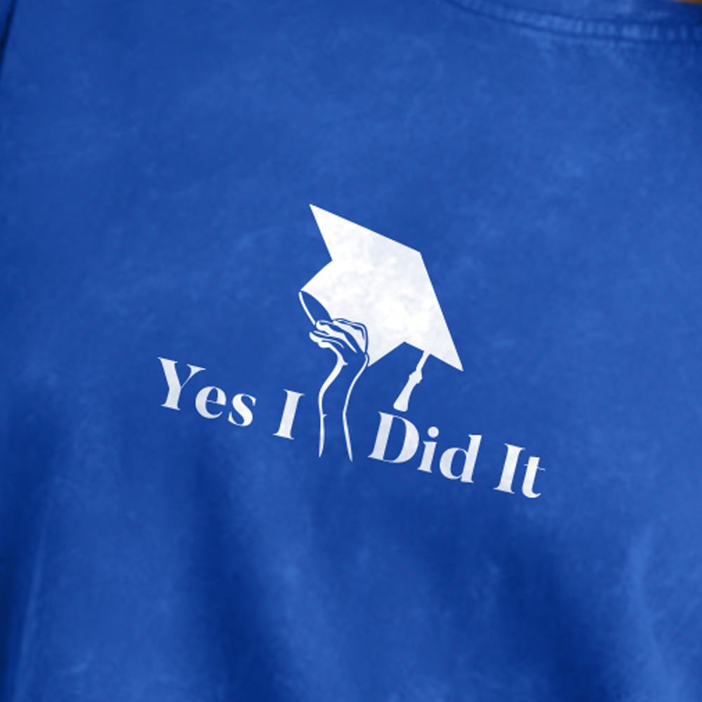 رقــبــة دائريـــــةقصـة واســعــةأكمـام قصيــرةمظهر مغسولطبعة بعبارة Yes I did it مع رمز قبعة التخرج , بلون متباين من الأمام